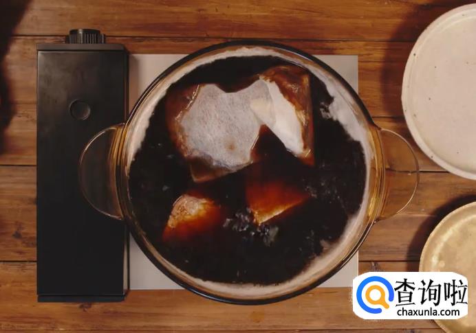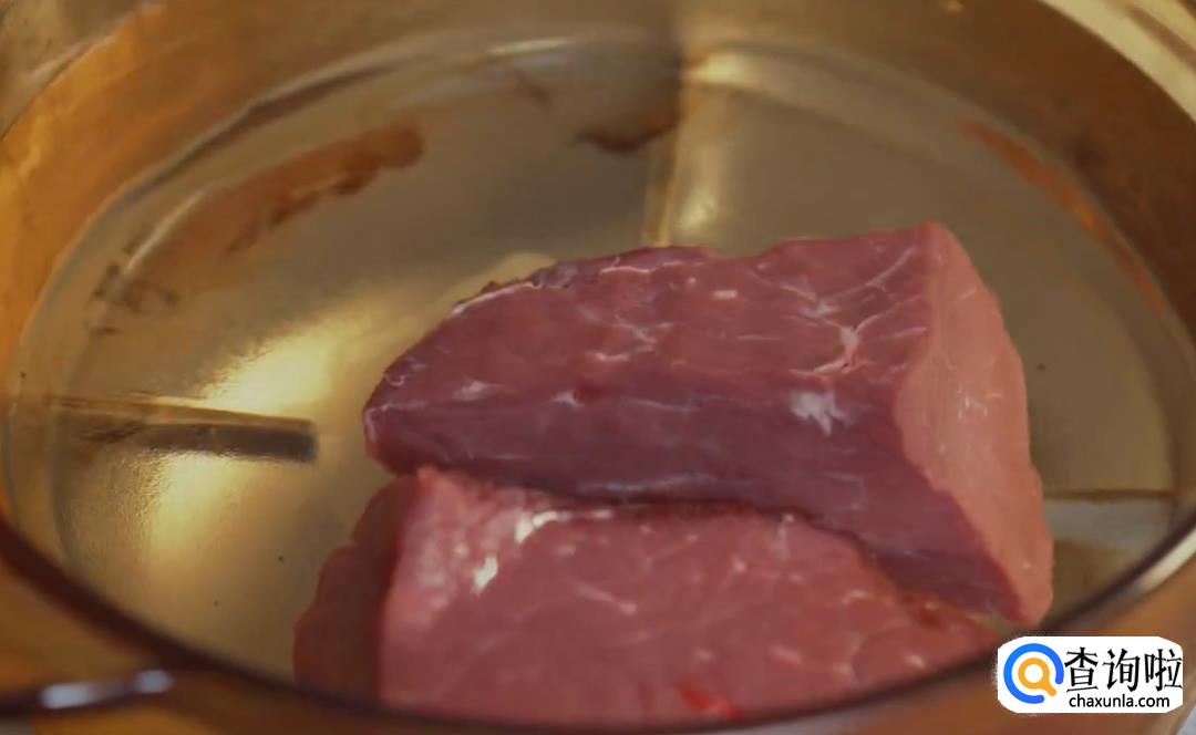 冷水锅中放入牛肉,待大火煮沸后,下料包;加入盐、老抽、生抽,调中火,慢炖2小时左右。至牛肉可以被筷子轻松戳透,沥水取出。