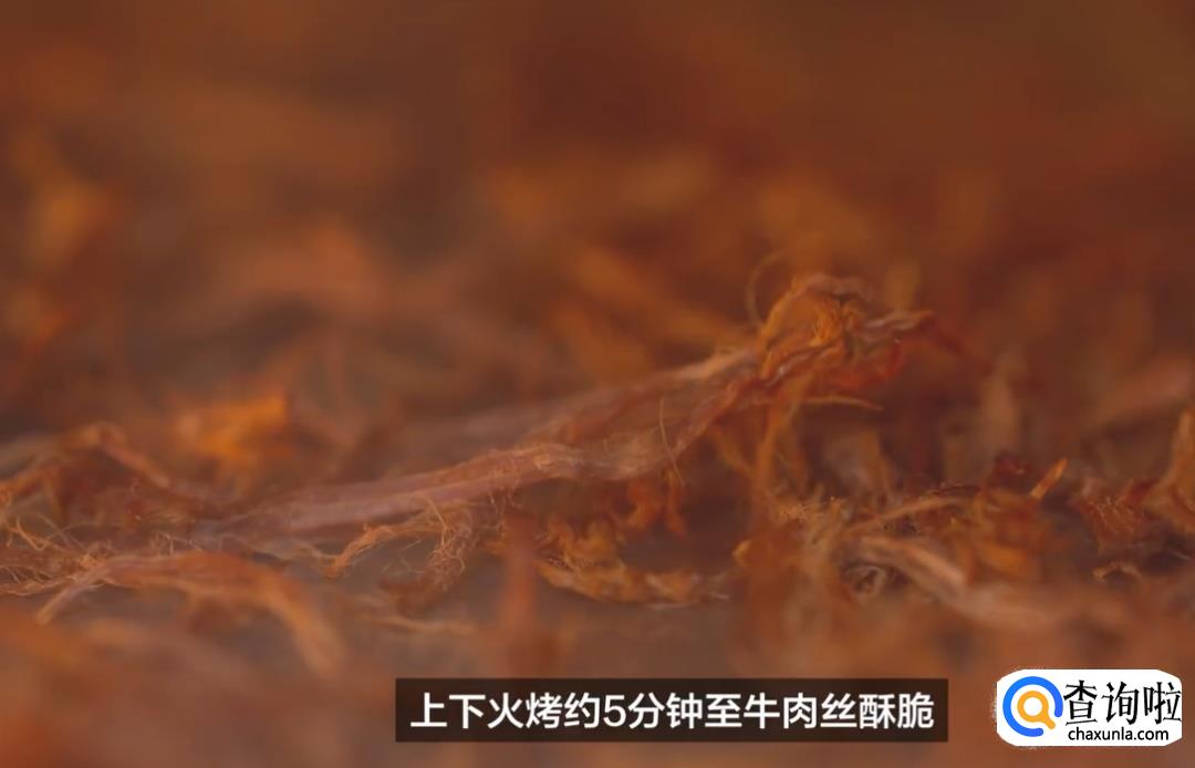 将牛肉丝平铺在烤盘中,放入预热到260度的烤箱,上下火烤约5分钟至牛肉丝酥脆,即可取出。