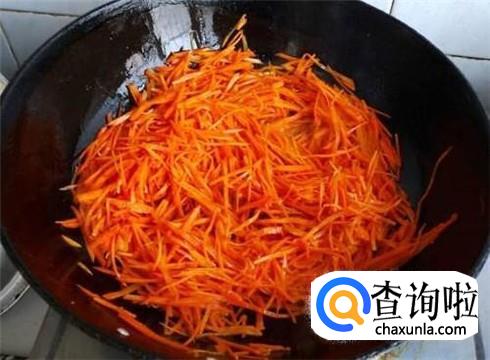 热锅下油,油热后,放入胡萝卜丝,加入少许的盐,把胡萝卜丝炒软。