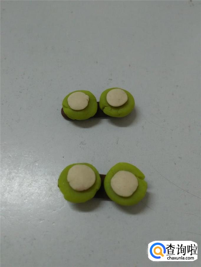 用棕色搓两个粗粗的圆条,再按扁,当作车架。