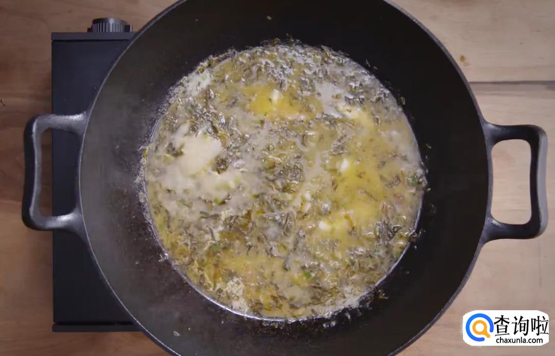 制作雪菜鱼片汤:锅内留余油,爆香葱末,下雪菜碎炒香,再倒入滤去渣的黄鱼汤,沸腾后加盐、糖,再将过油鱼片回锅,煮1分钟。
