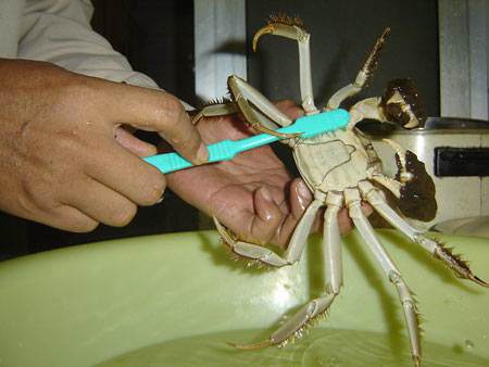 等螃蟹吐出的水不再混浊时,就可以开始刷洗了,这一步是需要胆量和一定技巧的,要注意防止被螃蟹的蟹钳夹到手指。你可以用大拇指和中指用力捏住螃蟹的左右两侧,并把蟹壳朝着上面。实践证明这种抓法是最安全的,不会被夹到。