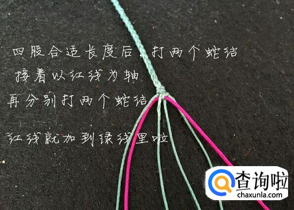 我们编到合适长度时,打两个蛇结,接着以红线为轴,再分别打两个蛇结,使红线加到绿线里面去。