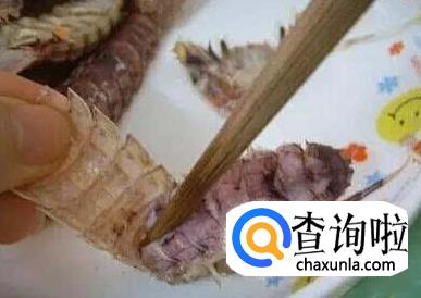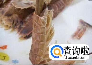 用一根筷子,从尾巴中间插进肉里,直到虾头的位置。