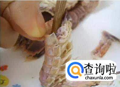 掰掉尾巴旁边的两只脚,虾尾向上拧然后扯下来。