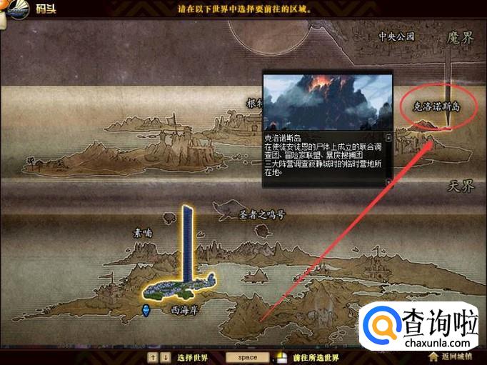 然后我们再由码头传送到克洛诺斯岛。传送完成后我们向右走一小段,之后向下走。