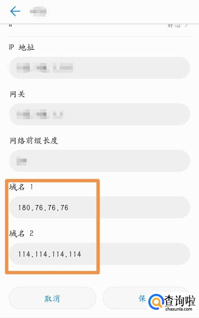 最后设置域名1、2。将域名1改为180.76.76.76,域名2改为114.114.114.114。点击保存即可。