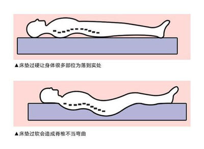 木板床和光板床等硬度太大的床会迫使人体难以维持脊柱正常生理曲线,腰部得不到支撑,时间长容易造成劳损,加重腰酸背痛等症状;过硬的床会使脊柱会处于僵挺紧张状态,需要腰背肌肉来支撑,腰部肌肉难以在睡眠中得到放松。