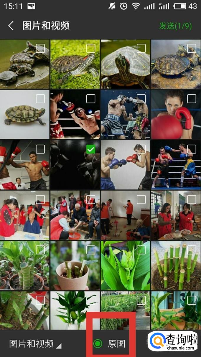 勾选图片,点上下方原图前面的按钮,点击右上角发送