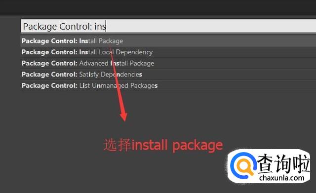 在弹出的Package Control界面中输入Ins,Sublime会自动模糊查询相应的内容,我们选择Install Package即可,如下图所示