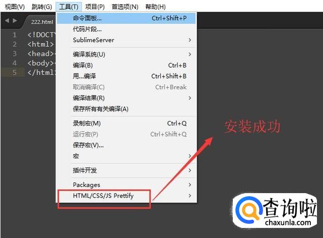 安装完毕以后我们点击顶部的工具菜单,然后查看下拉菜单中是否有HTML/CSS/JS Prettify选项,如果有则证明安装成功,如下图所示