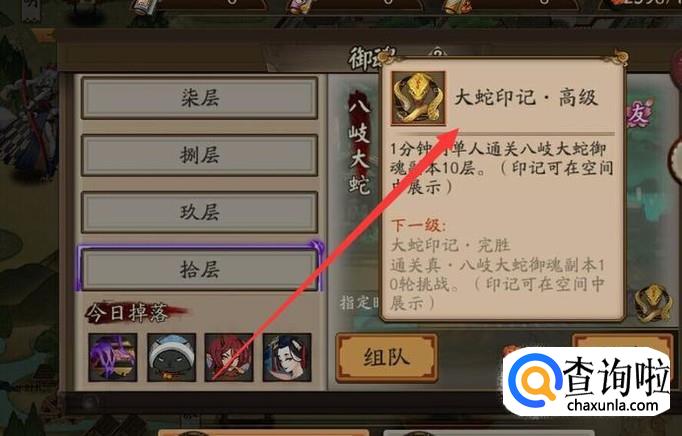 进入之后,需要通过御魂第十层获得大蛇的印记,如图所示。