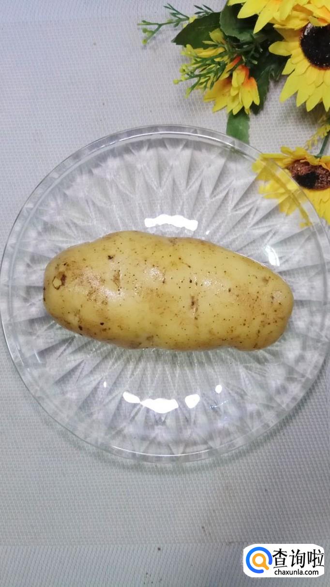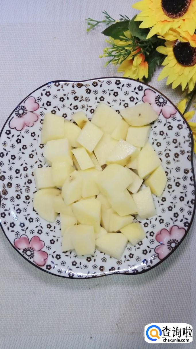 准备一个土豆,洗净去皮后,切成块儿,洗去淀粉,倒入锅中,和排骨一起翻炒。