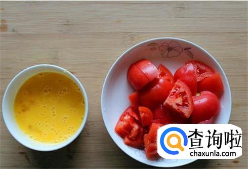 鸡蛋两个打散,西红柿去皮之后切成小块,青椒切丝,不喜欢吃青椒的不用放。