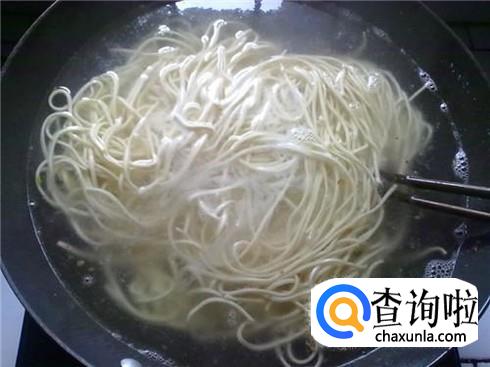 锅里烧开水,我个人喜欢吃手擀面,你要是喜欢吃挂面可以用挂面的,水烧开之后把面条放进去煮熟。
