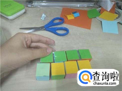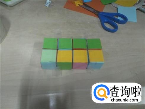 这八个小正方体做好了之后,将它们排成两排,当然他们朝上的颜色是要相同的,然后再将左上角的第一个和第二个小正方形用透明胶将它粘在一起。