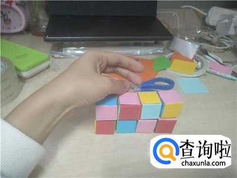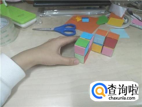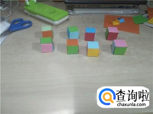 整好了之后,每种不同的颜色各分为六个小纸片,然后再将它分为八堆,每一堆得纸片进行重合,折叠,最后就会变成一个小的正方体的形状。