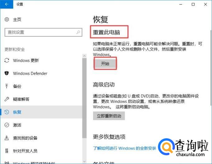 然后我们就可以看到重置此电脑,这个就是重装系统了,我们点击开始;