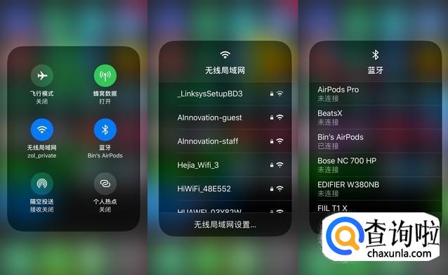 操作方法:屏幕上拉进入控制中心——重按 WiFi /蓝牙图标——选择需要连接的 WiFi /蓝牙设备