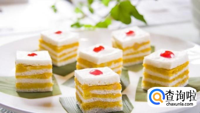 千层糕。北方地区的风味小吃。椰汁、蛋黄、红豆均可用于制作千层糕。其成品看起来有多层,所以被称为千层糕。