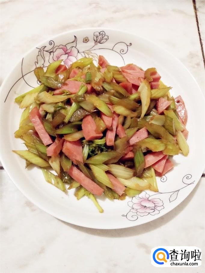 火腿不要炒太长时间,那样火腿就失去了原有的香味,将芹菜和火腿翻炒均匀后,就可以装盘了,这道菜,清香爽口,非常好吃。