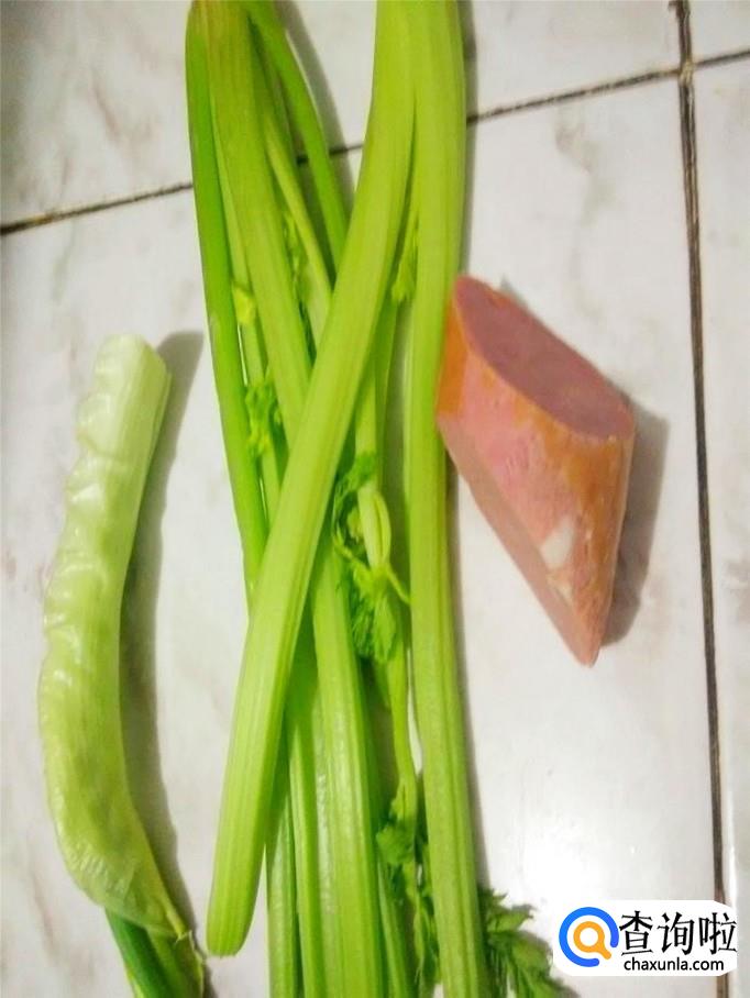 准备葱、芹菜、火腿,将芹菜洗净,葱剥好,火腿去掉肠衣。