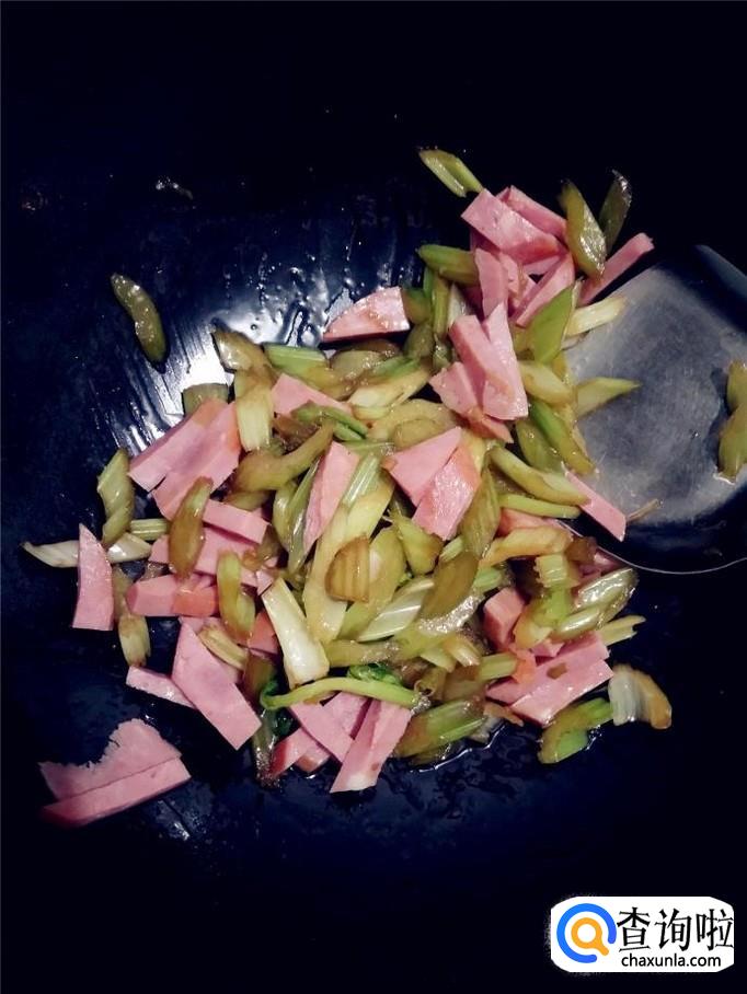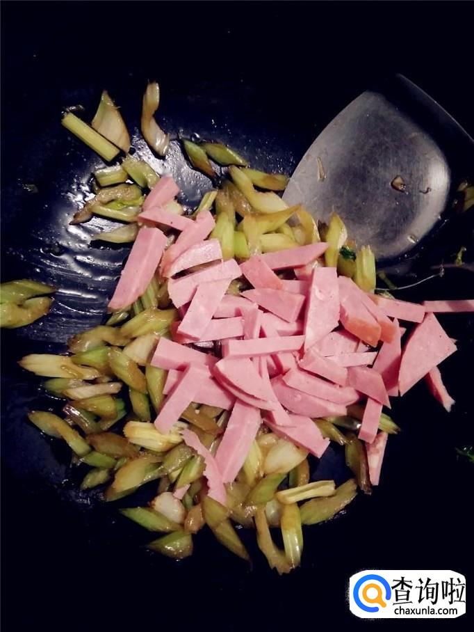 将芹菜炒至九分熟时,倒入火腿段一起炒。