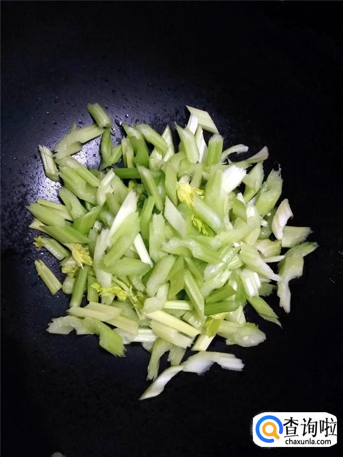 将芹菜片倒入锅中,翻炒均匀。