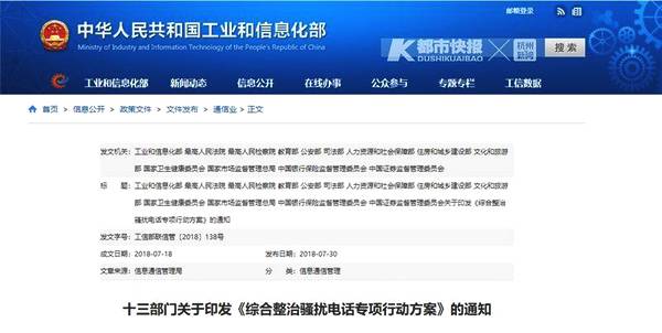 2018年7月,工信部、最高法、最高检、公安部等13部门印发《综合整治骚扰电话专项行动方案》,决定自2018年7月起至2019年12月底,在全国开展综合整治骚扰电话专项行动。