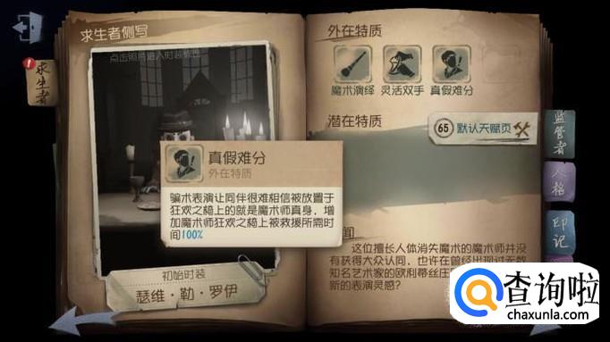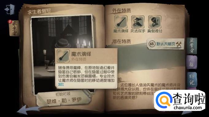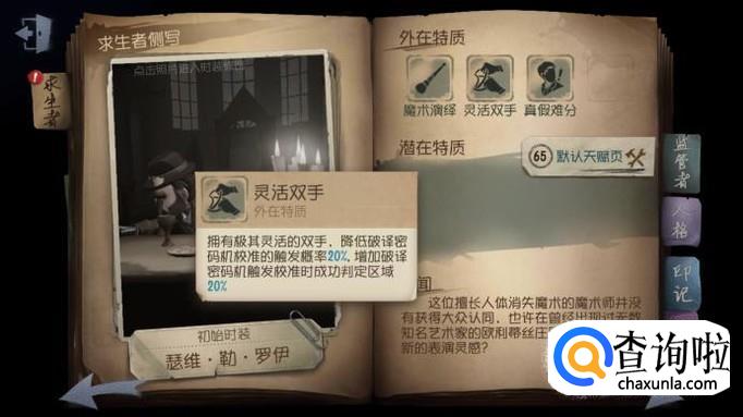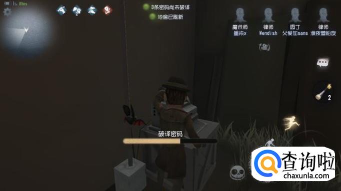 魔术师有“灵活双手”的技能,破译密码机的速度是比较快的,所以魔术师开局应该去找密码机,然后进行破译。