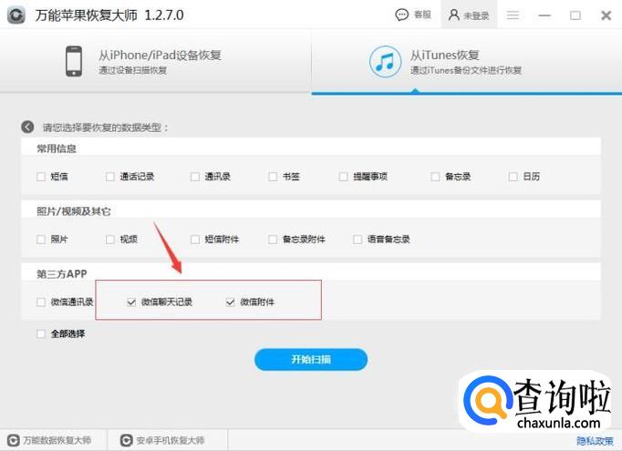 运行已经安装好的数据恢复软件,和iPhone手机连接后,弹出的界面上选择类型,这里要恢复的是微信聊天记录,所以关于微信的类型都可以勾选。