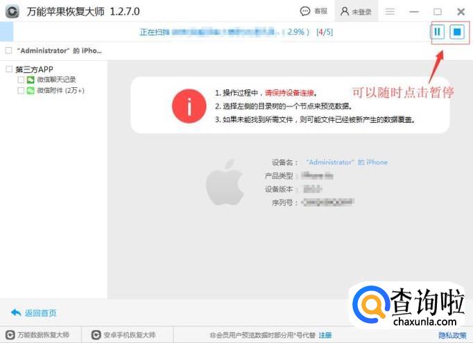 点击下一步,开始扫描,在扫描的时候,一定要耐心等待,当然,如果有事的话,也是可以点击右上角的暂停按钮,先停止扫描。