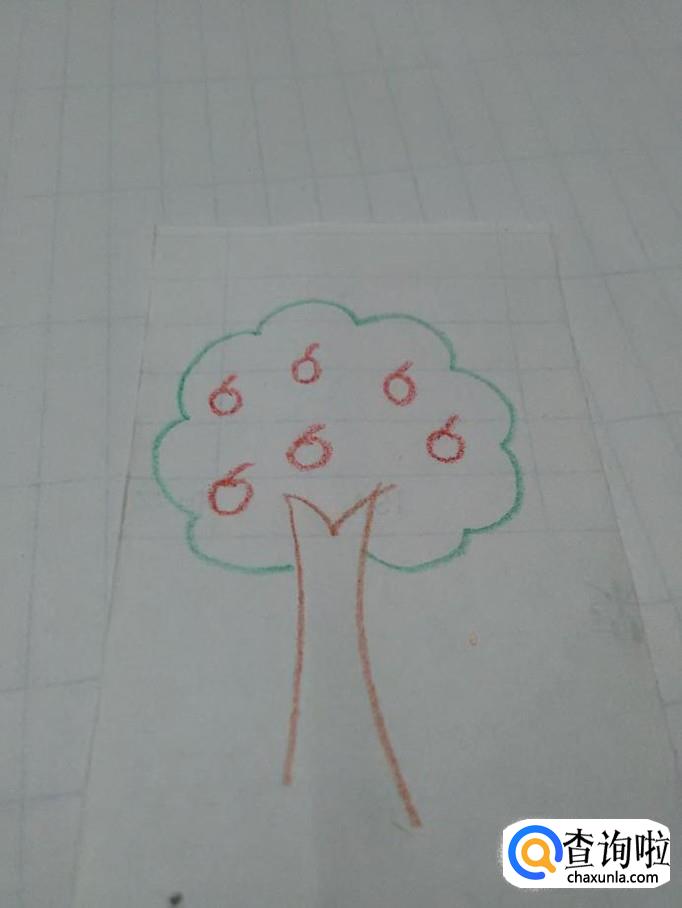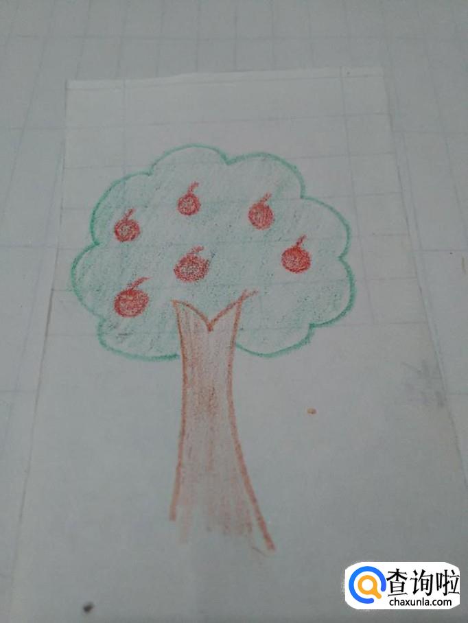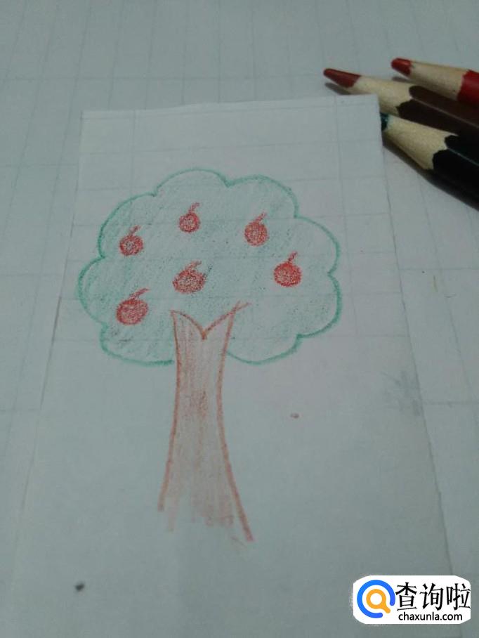 最后用棕色笔涂树干,用绿笔涂树冠,用红笔涂苹果,苹果树就画完了。