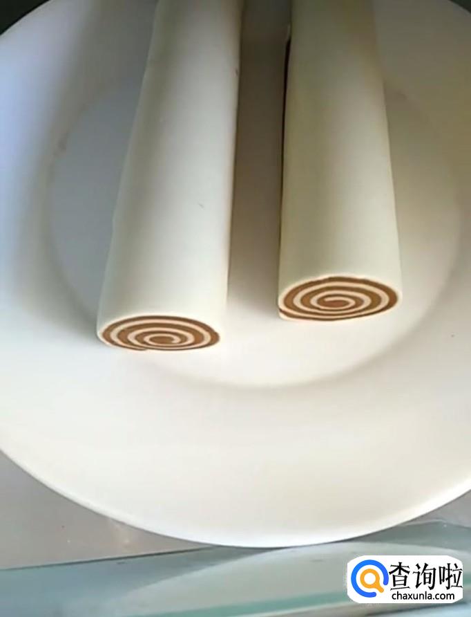 接着我们分别把两个面团用擀面杖擀成大薄片,擀好以后将红糖的面团放在牛奶的面团上面卷起来