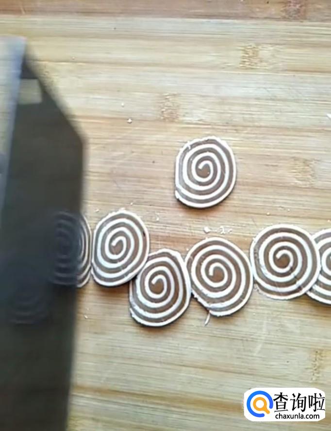 然后我们将卷好的面团放入冰箱冷藏两个小时左右,冷藏好以后取出来用刀切成一元硬币厚度大小的片