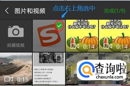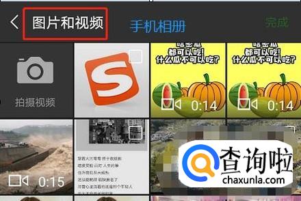 再次点击左侧的图片标志进入到图片和视频选择页面,这次我们点击视频文件(视频文件右上角没有选择框),直接点击视频以后在弹出的页面右上角点“完成”,如下图