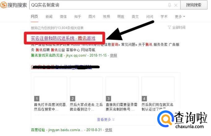 首先我们打开搜狗浏览器,输入QQ实名制查询,点击链接。如图。