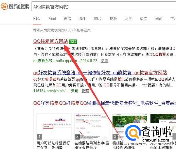 进入之后,搜索“QQ恢复官方网站”点击并进入,如图所示。