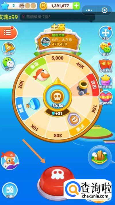 在游戏界面有一个大转盘,通过点击按钮让转盘转起来,转到转盘中的攻击,就可以自动去攻击别人,如下图。