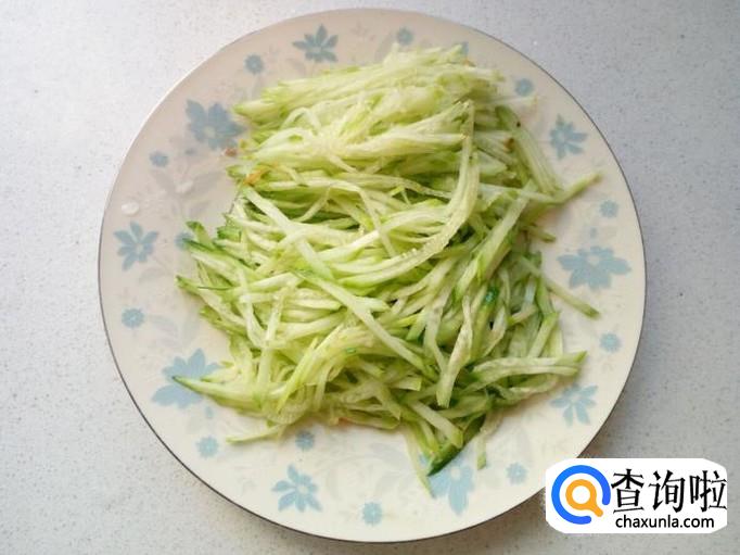 黄瓜用水清洗干净,控干水分,切成丝。