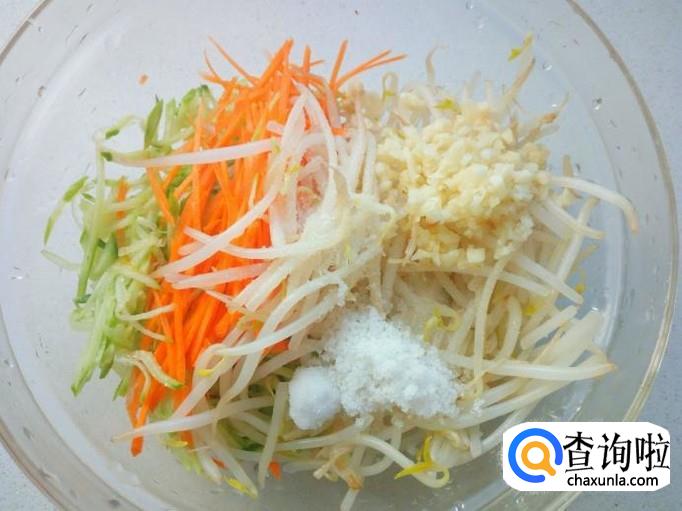 把焯好的绿豆芽,切好的胡萝卜丝,黄瓜丝,蒜末,一起放入碗中。放入盐,味精,白糖,醋(酸甜咸口味自己掌握)。