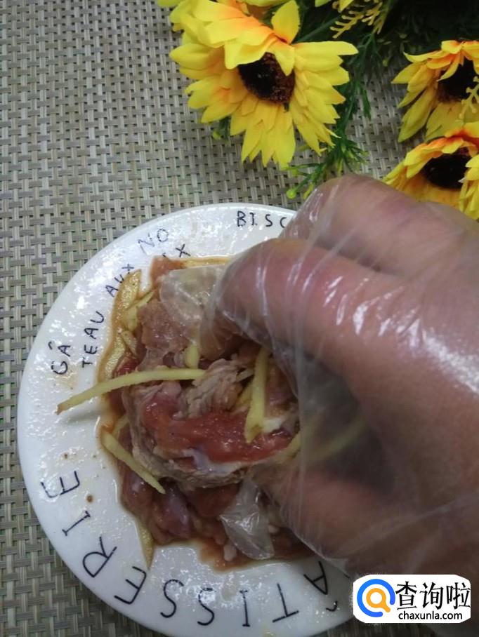 将姜切成细丝,放入盘中,再放入适量盐和鸡精。