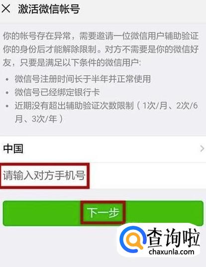自己用手机操作完成以后,现在去求租好友帮你辅助完成下一步。先输入对方的手机号。再点击“下一步”。