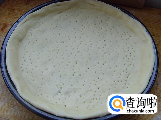 将面粉300克左右(2个9寸皮萨的量),糖2小勺,盐1小勺,酵母1.5小勺,黄油20克融化,加适量水和成面团。
