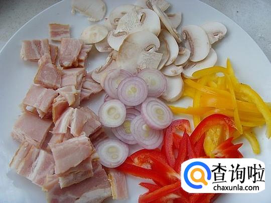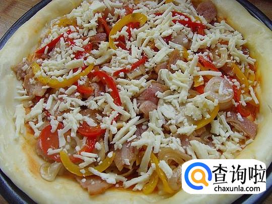 将材料逐步放上去、洋葱、大青红椒、口蘑一起铺在面皮上,最后铺上一层培根,最后再放一层马苏奶酪丝。