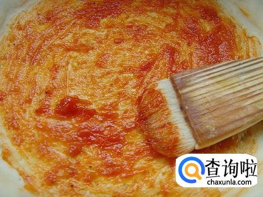 烤好的饼皮取出,抹上一层披萨酱,铺上一层马苏奶酪丝。