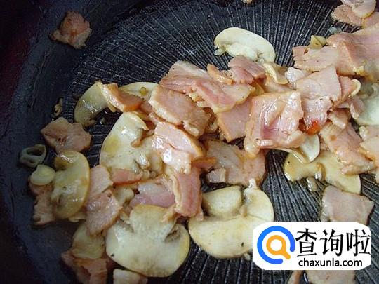 切好的培根和口蘑可以用少许油煎一下,这样做出来会比较香。