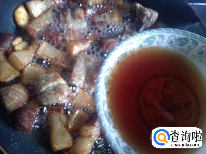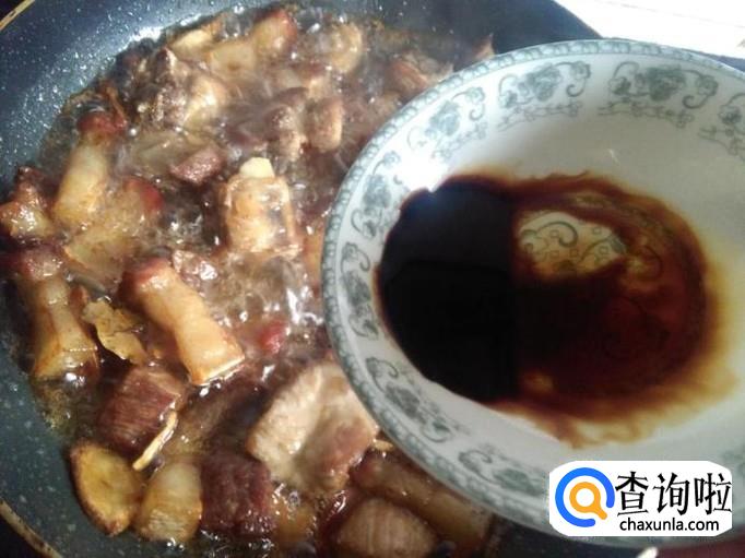 转大火,加入半碗黄酒烹香,黄酒不仅可以去腥,还会让猪肉的口感Q弹,再倒入少许酱油翻炒均匀