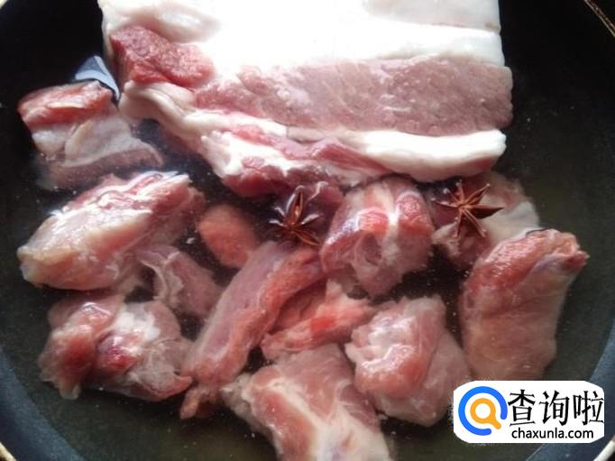 将猪肉用温水洗干净,凉水入锅焯水,焯水时锅中放一些大料和黄酒
