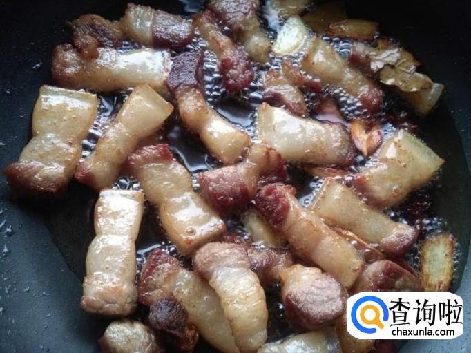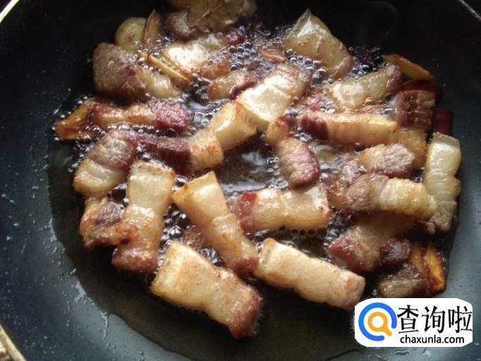 将五花肉放入锅中,小火煸炒出油脂,五花肉多煸炒会,吃起来才不会腻
